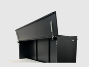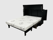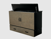 The Metro is a free-standing CabinetBed that transforms into a queen size bed under 30 seconds, no wall mounting or permanent installation required. Its sleek styling, clean lines and Pebble Grey panel with black all around give it a unique 2 tone look. By lifting the lid and opening side doors, it gives a nice open feeling to the bed.